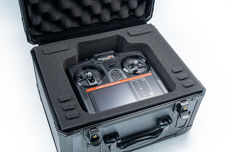 Das robuste Aluminiumgehäuse schützt den Sender zuverlässig vor Stößen, Druck und äußeren Einflüssen. Zwei stabile Verschlussriegel sorgen dafür, dass der Koffer sicher verschlossen bleibt – ideal für Transport zur Rennstrecke oder zur sicheren Aufbewahrung zu Hause.