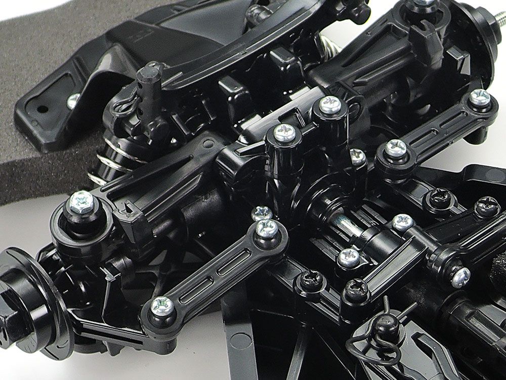 Das wellengetriebene 4WD-Chassis des TT-02 ist in Längsrichtung angeordnet, wobei sich die Batterie auf der linken und der Motor auf der rechten Seite befindet, um eine hervorragende Stabilität zu gewährleisten. Darüber hinaus verfügt es über identische linke und rechte Aufhängungsarme und Achsschenkel, was die Montage erleichtert, sowie über leicht zu wartende Getriebe. Es ist ein äusserst anpassungsfähiges Fahrgestell, denn es bietet 2 verschiedene Radstände, 2 Einstellungen für Bodenfreiheit und 2 Spurweiten sowie 10 mögliche Getriebeübersetzungen. Auch die Optik kommt nicht zu kurz, mit Radnaben in Form von Bremsscheiben und stilvollen vorderen Stossstangenhaltern.